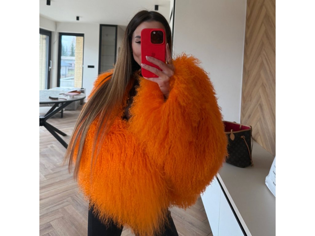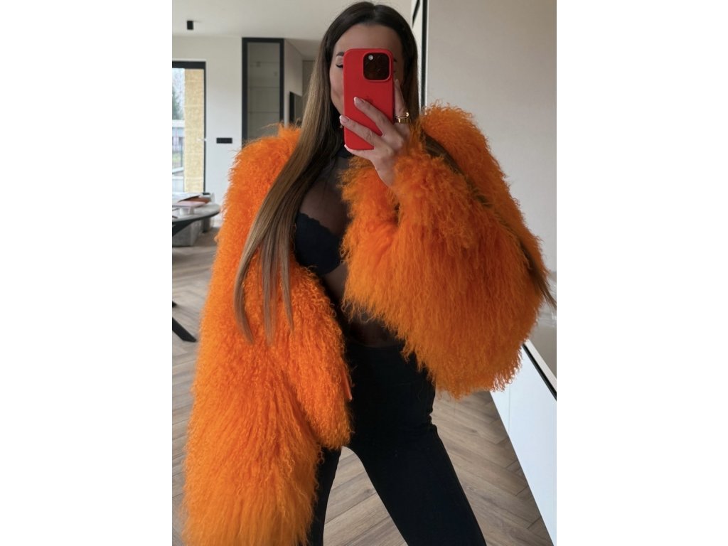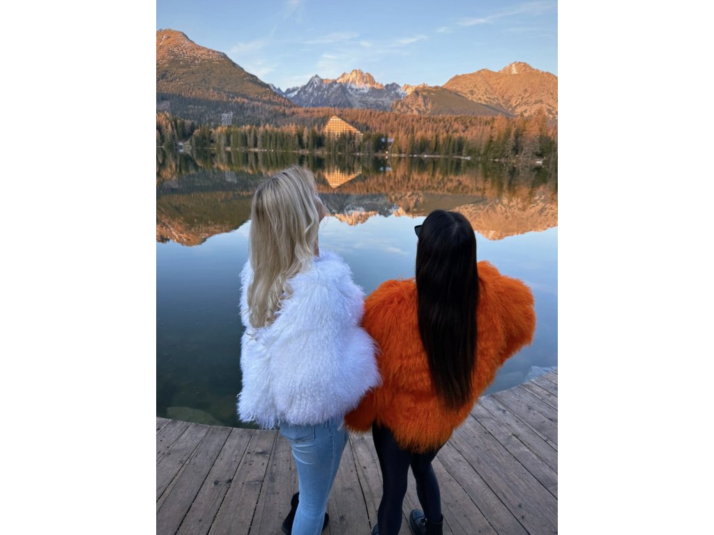 Modelka na foto má na sebe kožuch s dĺžkou 50cm, rukávy 60cm, obvod 90cm.